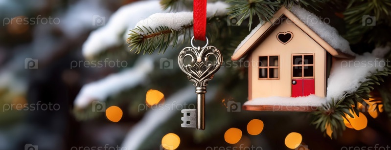 Елочная игрушка с ключом и крошечным домиком со снегом и праздничными огнями