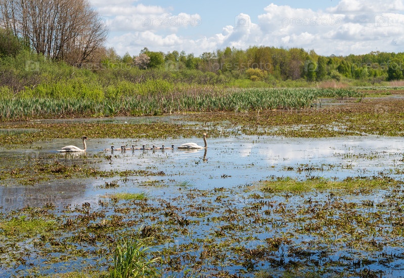Семья лебедей на озере. Осень и лебеди в природе