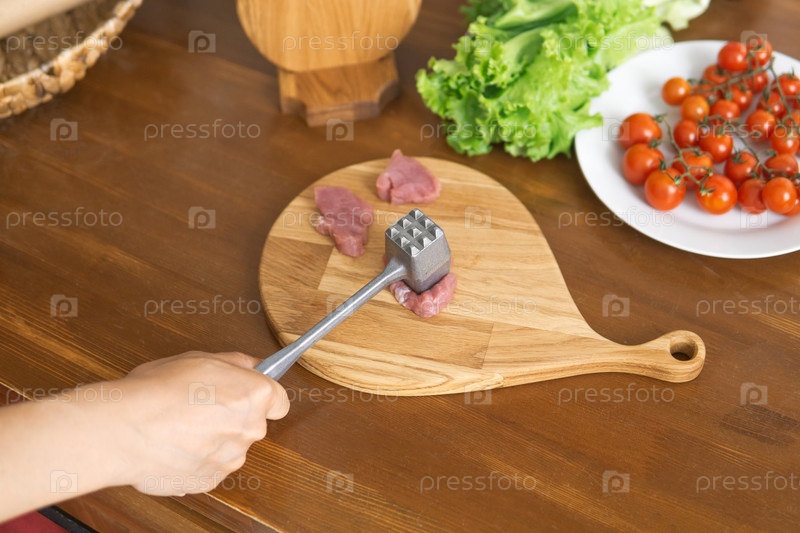 Человек отбивает мясо молотком
