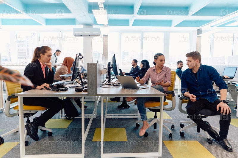 Совместный процесс многонациональной квалифицированной молодой бизнес-команды во время мозгового штурма в офисе. Разнообразная группа молодых людей, одетых в официальную одежду, сотрудничает в разработке дизайн-проекта