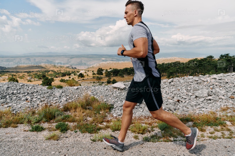 Решительный спортсмен бежит по пересеченной горной местности на рассвете