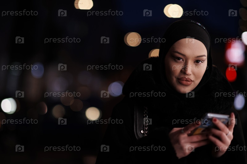Европейская мусульманка в хиджабе, бизнес-леди, проверяет свой телефон на городской улице ночью