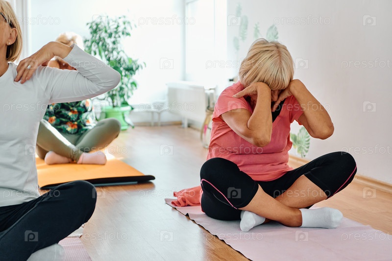 Группа пожилых женщин занимается различными упражнениями йоги, включая растяжку шеи, спины и ног, под руководством тренера в залитом солнцем месте, способствуя благополучию и гармонии
