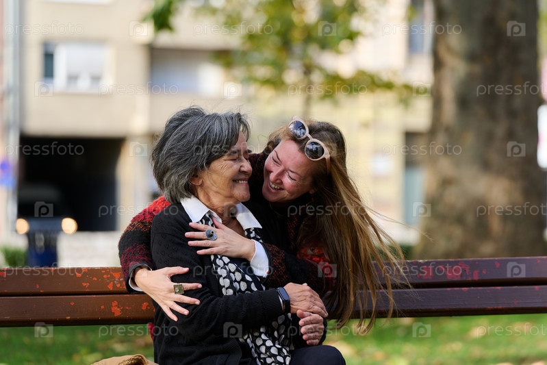 Обнимая поколения: любовь и поддержка дочери для ее пожилой матери в солнечный день в парке