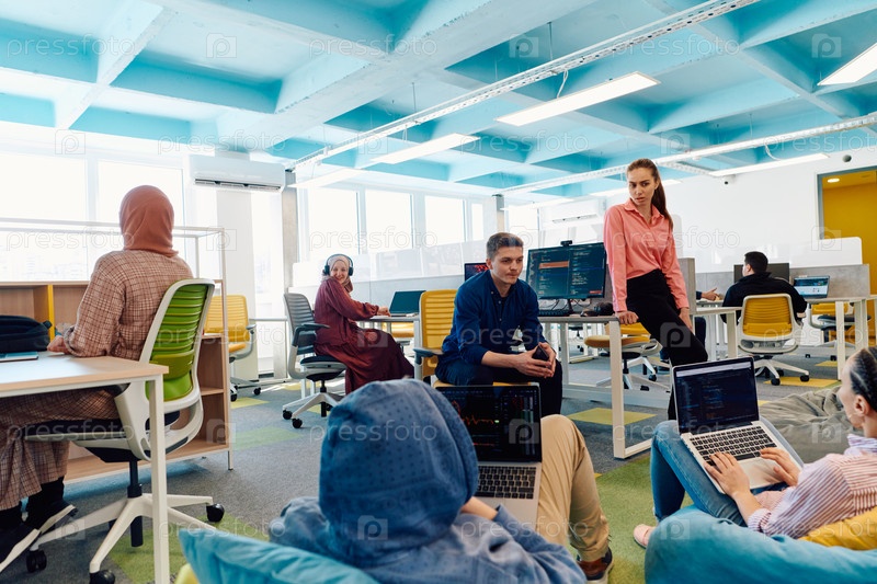 В современном офисе стартапа разнообразная группа молодых и способных бизнесменов ведет оживленные обсуждения различных проектов, демонстрируя командную работу, инновации и предпринимательский дух