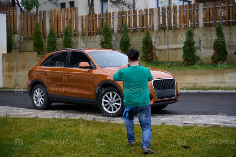 Мужчина тщательно моет и чистит свою машину на подъездной дорожке к дому, демонстрируя гордость за свое транспортное средство и прилегающую территорию