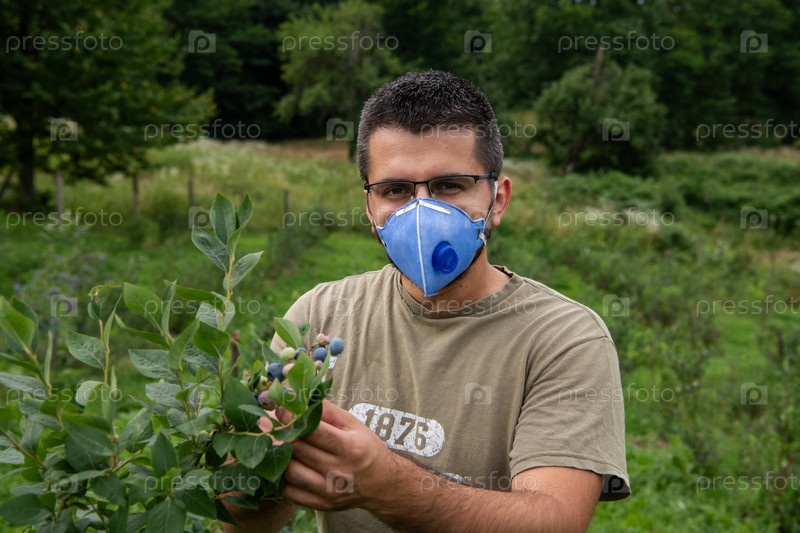 Фермер в защитной маске проверяет качество черники и наличие вредителей на своей небольшой ферме