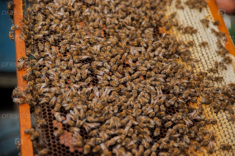Сотовая рамка с пчелами, медом и расплодом