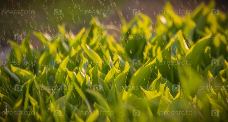 Капли дождя в размытом виде видны на зеленых листьях ландышей в солнечном свете