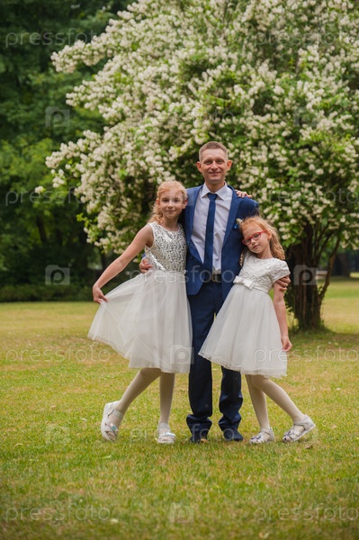 Жених на свадьбе с двумя девушками в белых платьях
