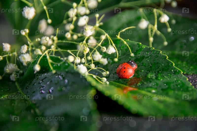 Божья коровка на фоне цветка с зеленым листом