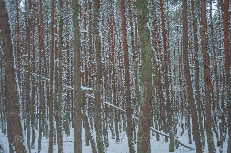 Стволы деревьев зимой в густом лесу в снегу