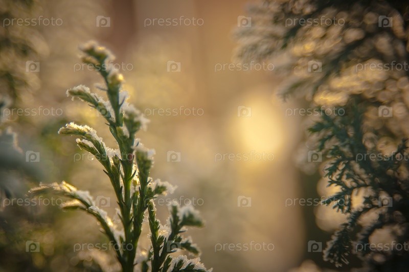 Зимний иней на зеленых ветвях елки, рождественский фон