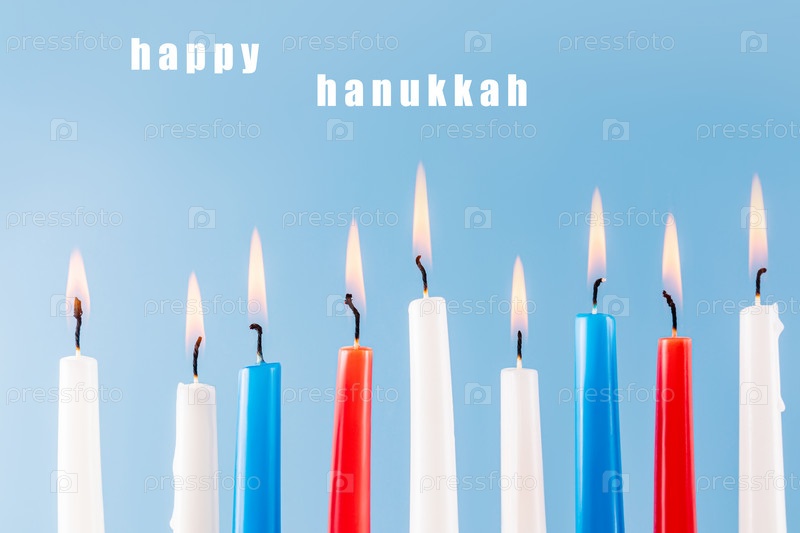 Красивый праздничный фон для праздника Ханука с горящими свечами на синем фоне. Текст белыми буквами счастливой Хануки