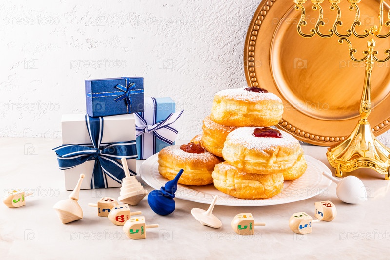Множество свежеиспеченных домашних пончиков на тарелке среди подарков на Хануку на мраморном столе с минорах и дрейдалом. Вид спереди