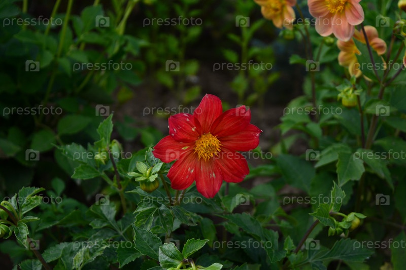 Красный георгин на фоне зеленых листьев