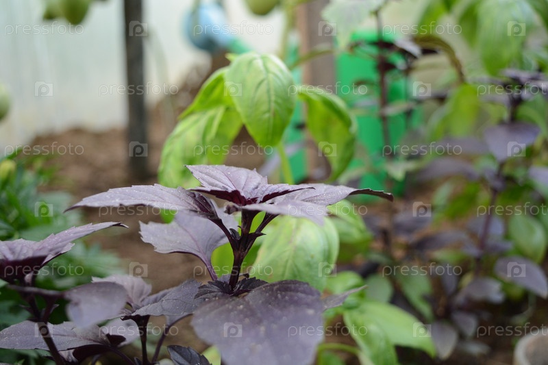 Кустики зеленого и фиолетового базилика