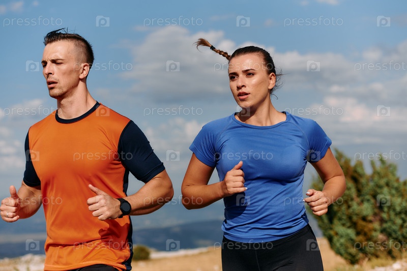 Пара в спортивной одежде бежит по живописной дороге во время утренней тренировки, наслаждаясь свежим воздухом и поддерживая здоровый образ жизни