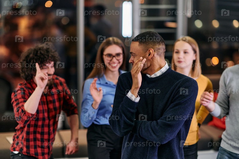 Группа молодых бизнесменов развлекается, играя в интересные игры, отдыхая от работы в современном офисе. Избирательный фокус