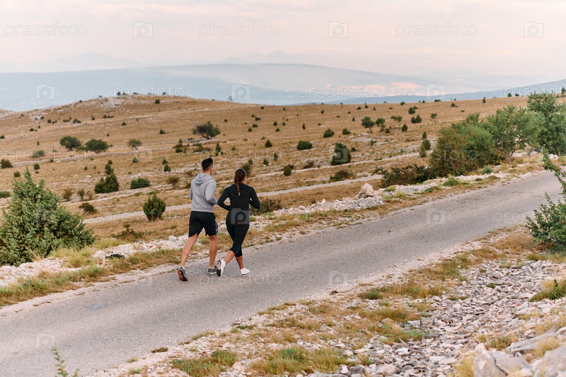 Пара в спортивной одежде бежит по живописной дороге во время утренней тренировки, наслаждаясь свежим воздухом и поддерживая здоровый образ жизни