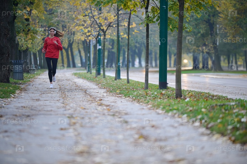 Молодая красивая женщина бежит в осеннем парке и слушает музыку в наушниках на смартфоне