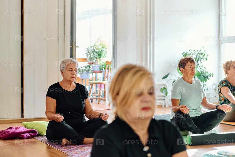Группа пожилых женщин занимается различными упражнениями йоги, включая растяжку шеи, спины и ног, под руководством тренера в залитом солнцем месте, способствуя благополучию и гармонии
