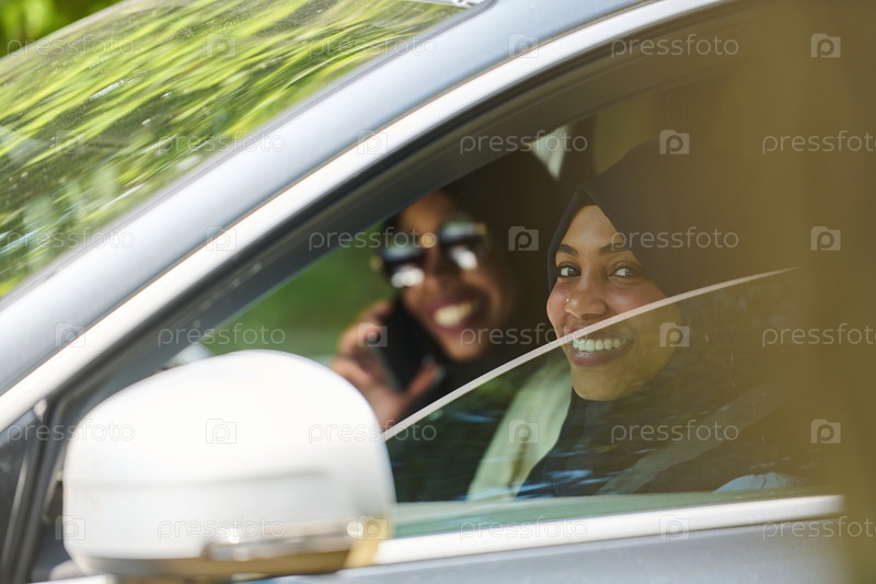 Две мусульманки в хиджабах разговаривают по смартфону, путешествуя вместе в машине по