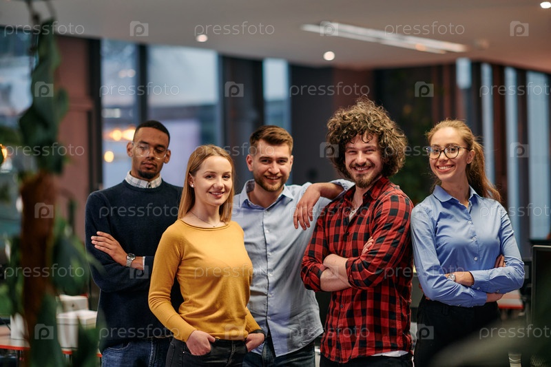 Портрет успешной творческой бизнес-команды, смотрящей в камеру и улыбающейся. Разнообразные деловые люди, стоящие вместе на старте. Избирательный фокус