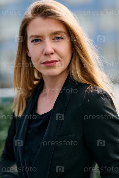 Портрет стильной деловой блондинки, позирующей на террасе в городском пейзаже