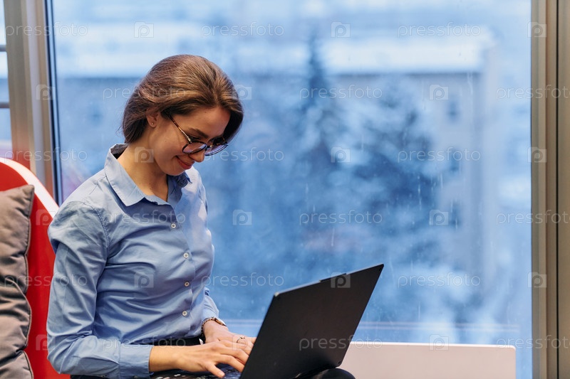 Деловая женщина пользуется ноутбуком, сидя у окна большого корпоративного здания, на фоне которого открывается живописный вид на городской пейзаж