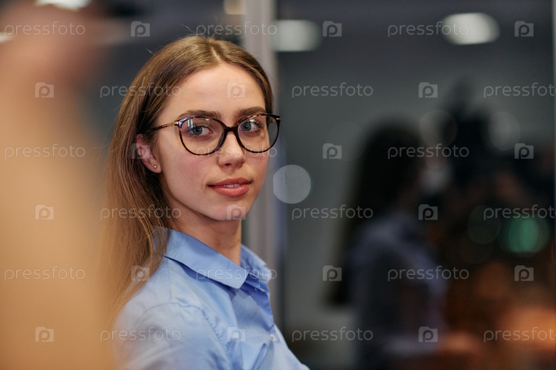 Уверенная в себе бизнес-леди в очках и синей рубашке участвует в офисной дискуссии