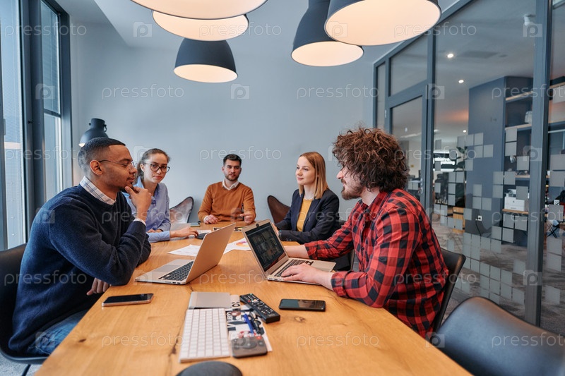 В яркой атмосфере современного офиса стартапа разнообразная команда профессионалов в сфере бизнеса участвует в обсуждениях различных проектов и разрабатывает новые бизнес-стратегии, олицетворяя креативность и инновации в предпринимательской среде