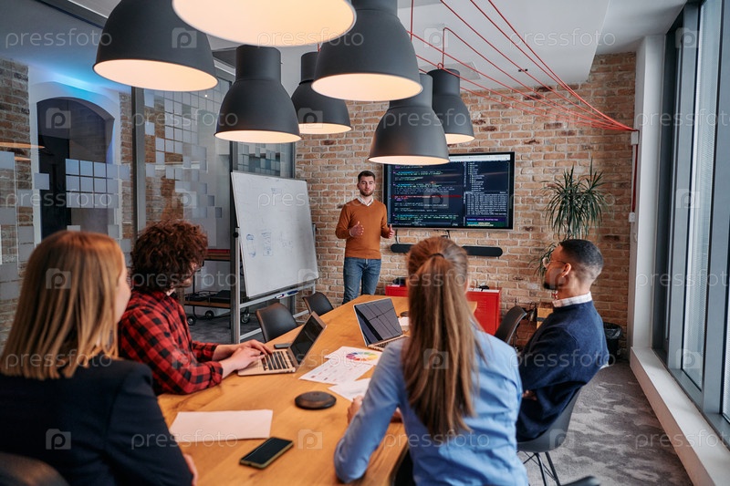 В корпоративной обстановке бизнесмен проводит совещание, страстно представляя бизнес-план своей внимательной команде, способствуя сотрудничеству и стратегическому мышлению