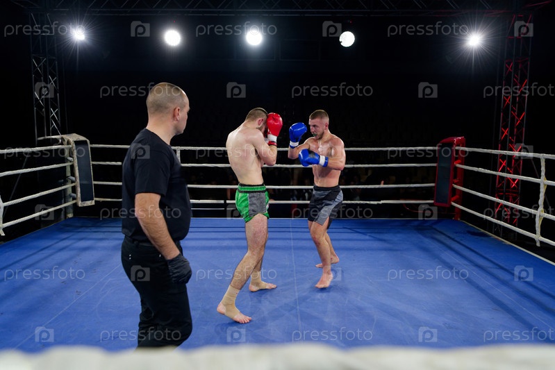 Соперники по кикбоксингу наносят мощные удары ногами в захватывающем поединке