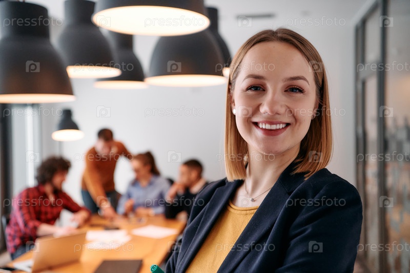 Уверенная в себе светловолосая бизнес-леди руководит командой в современной офисной обстановке