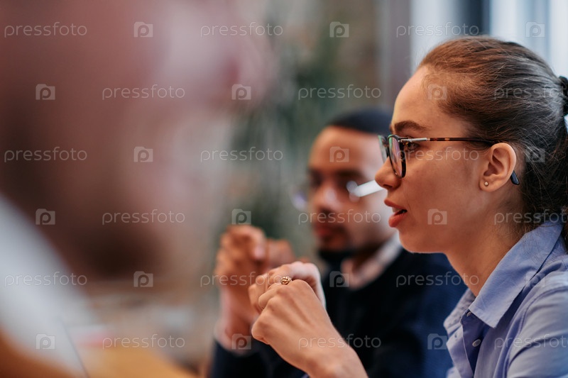Бизнес-леди ведет дискуссию в современном офисе