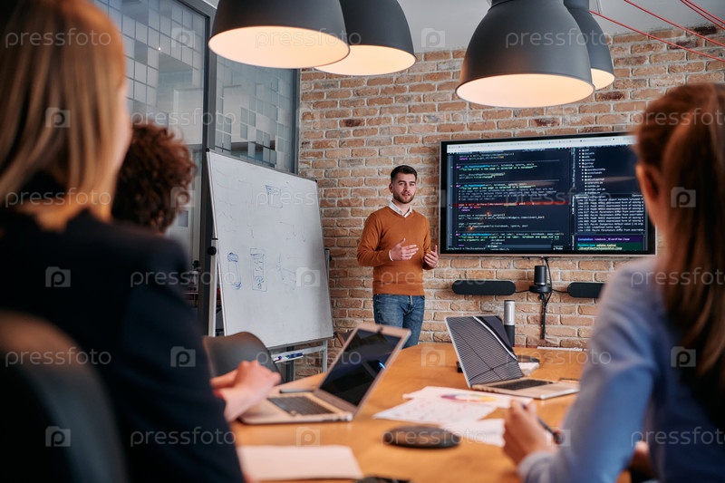 В корпоративной обстановке бизнесмен проводит совещание, страстно представляя бизнес-план своей внимательной команде, способствуя сотрудничеству и стратегическому мышлению