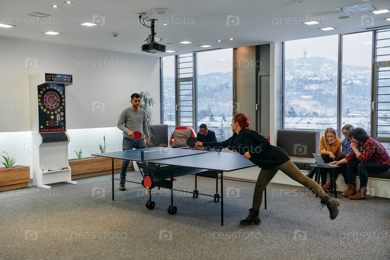 Коллеги по бизнесу отдыхают от работы, чтобы поиграть в настольный теннис, способствуя командной работе и товариществу на рабочем месте