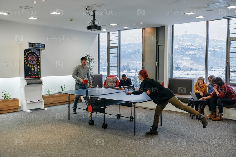 Коллеги по бизнесу отдыхают от работы, чтобы поиграть в настольный теннис, способствуя командной работе и товариществу на рабочем месте