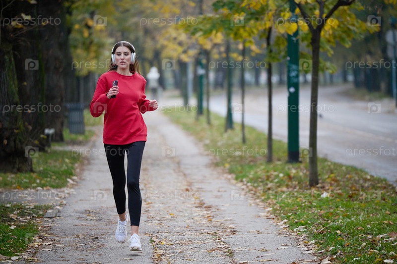 Молодая красивая женщина бежит в осеннем парке и слушает музыку в наушниках на смартфоне