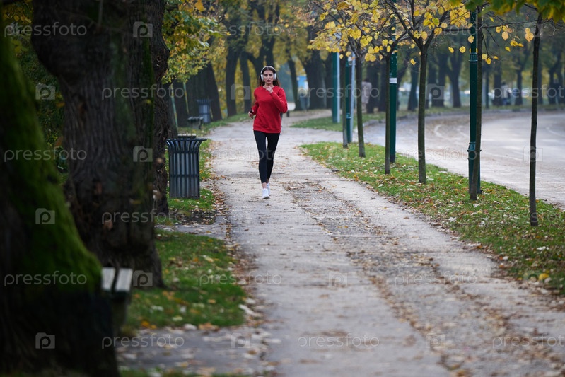 Молодая красивая женщина бежит в осеннем парке и слушает музыку в наушниках на смартфоне