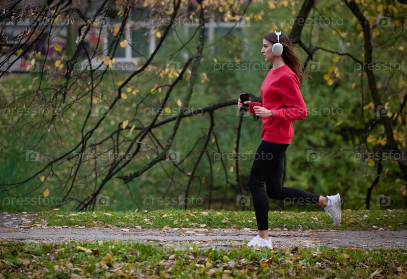 Молодая красивая женщина бежит в осеннем парке и слушает музыку в наушниках на смартфоне