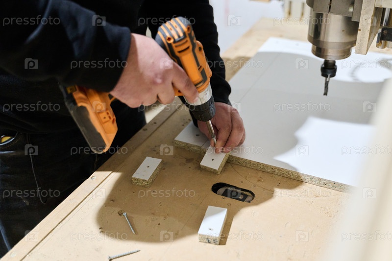 Крупный план рабочего, сверлящего деревянные доски для подготовки к дальнейшей обработке