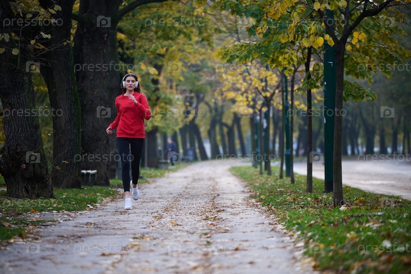 Молодая красивая женщина бежит в осеннем парке и слушает музыку в наушниках на смартфоне