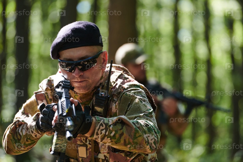 Элитный солдат, замаскированный и скрытно перемещающийся по опасной лесной местности, выполняет секретную миссию в уединенном лесном районе