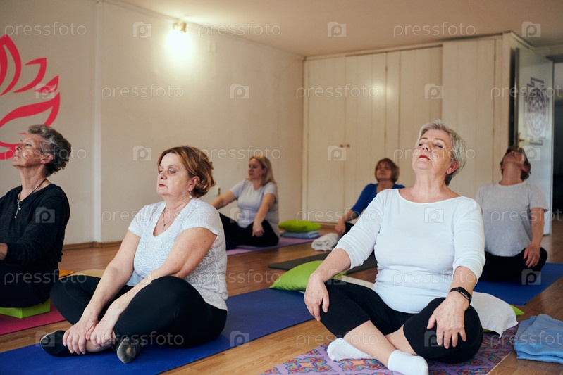 Группа пожилых женщин занимается различными упражнениями йоги, включая растяжку шеи, спины и ног, под руководством тренера в залитом солнцем месте, способствуя благополучию и гармонии
