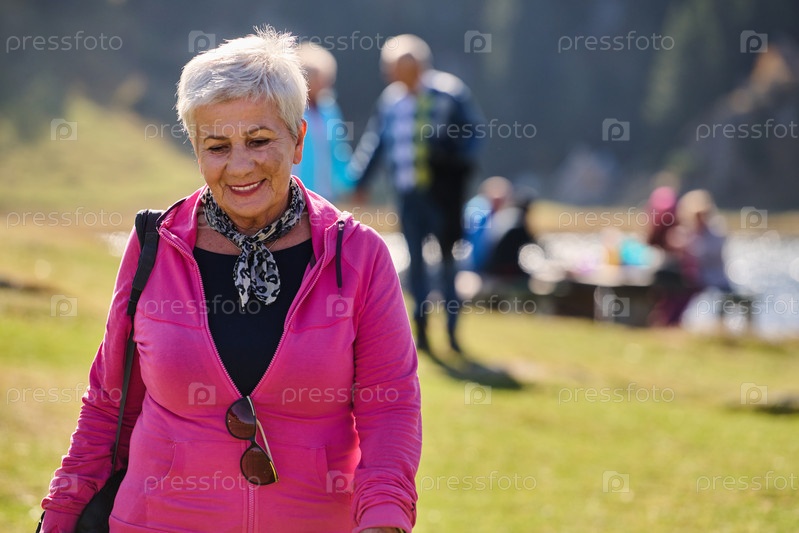 Пожилая женщина обретает спокойствие и благополучие во время прогулки на природе, демонстрируя красоту активного и здорового образа жизни в ее золотые годы