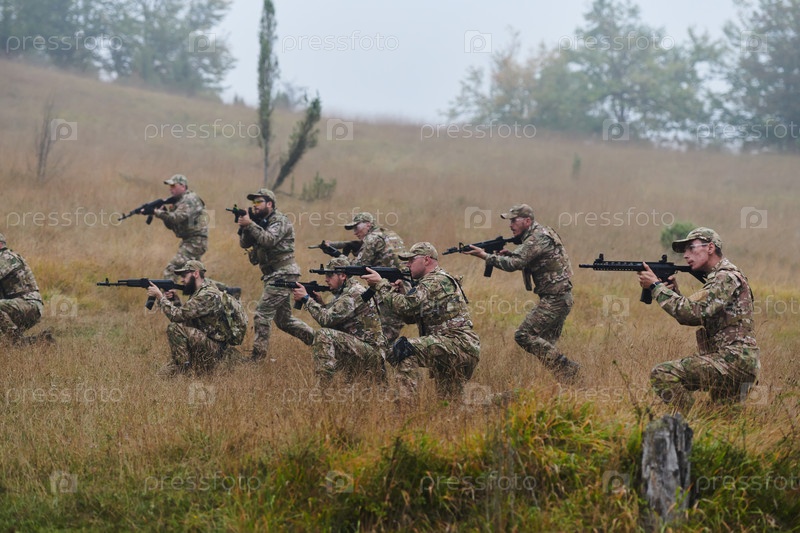Дисциплинированное и специализированное военное подразделение, облаченное в камуфляж, осуществляющее стратегическое патрулирование и сохраняющее контроль в обстановке с высокими ставками, демонстрирующее свою точность, сплоченность и готовность к специаль