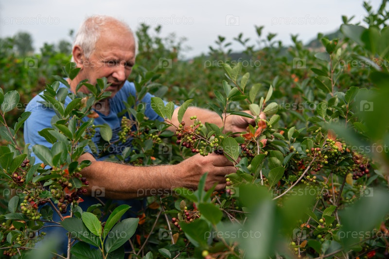 Старший фермер тщательно осматривает свою черничную ферму, чтобы убедиться в качестве и прогрессе