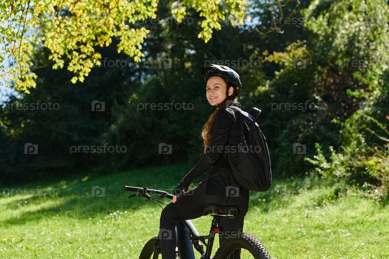 В лучезарных объятиях солнечного дня радостная девушка, облаченная в профессиональную велосипедную экипировку, находит чистое блаженство и жизненную силу, катаясь по парку на своем велосипеде, а ее заразительный смех отражает беззаботную гармонию момента